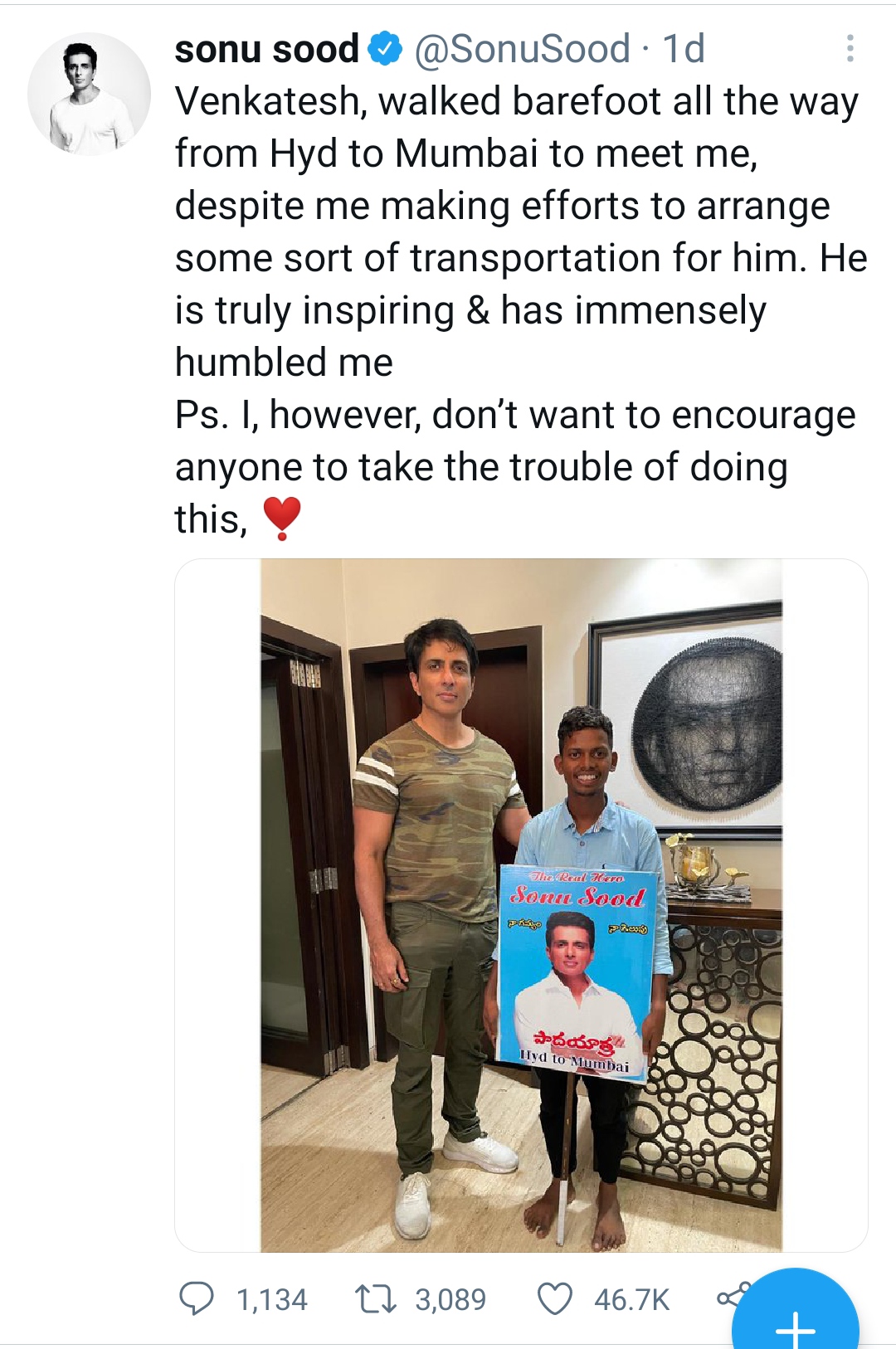 सोनूला भेटण्यासाठी त्याने हा लांबलचक पल्ला गाठला. सोनूने त्याच्या ट्विटर अकाऊंटवरुन व्यंकटेशसोबतचा फोटो शेअर करत एवढ्या भरीव प्रेमासाठी आभार मानले आहेत.