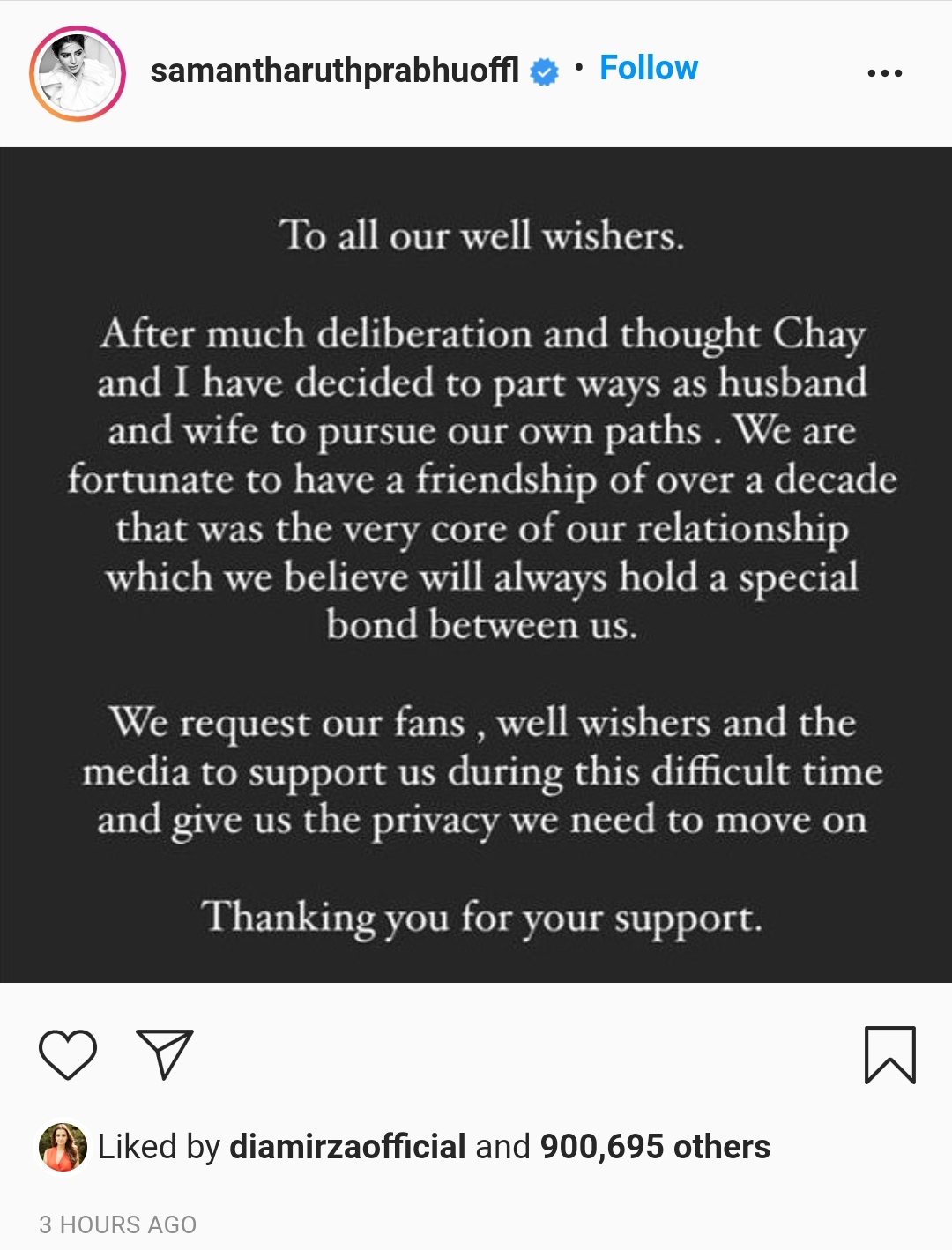 समंथा पुढे म्हणते, ‘आम्ही आमच्या चाहत्यांना, शुभचिंतकांना आणि माध्यमांना विनंती करतो की, या कठीण काळात आम्हाला साथ द्यावी आणि यातून पुढे जाण्यासाठी आम्हाला प्रायव्हसी द्यावी. तुम्हा सगळ्यांच्या सोबतीसाठी आभार’, असं समंथाने म्हटलं आहे.