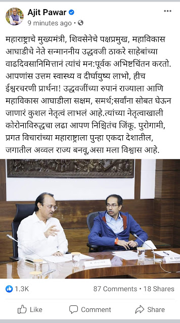 महाराष्ट्राचे मुख्यमंत्री, शिवसेनेचे पक्षप्रमुख, महाविकास आघाडीचे नेते सन्माननीय उद्धवजी ठाकरे साहेबांच्या वाढदिवसानिमित्तानं त्यांचं मन:पूर्वक अभिष्टचिंतन करतो. आपणांस उत्तम स्वास्थ्य व दीर्घायुष्य लाभो, हीच ईश्वरचरणी प्रार्थना! उद्धवजींच्या रुपानं राज्याला आणि महाविकास आघाडीला सक्षम, समर्थ;सर्वांना सोबत घेऊन जाणारं कुशल नेतृत्वं लाभलं आहे.त्यांच्या नेतृत्वाखाली कोरोनाविरुद्धचा लढा आपण निश्चितंच जिंकू. पुरोगामी, प्रगत विचारांच्या महाराष्ट्राला पुन्हा एकदा देशातील, जगातील अव्वल राज्य बनवू,असा मला विश्वास आहे.