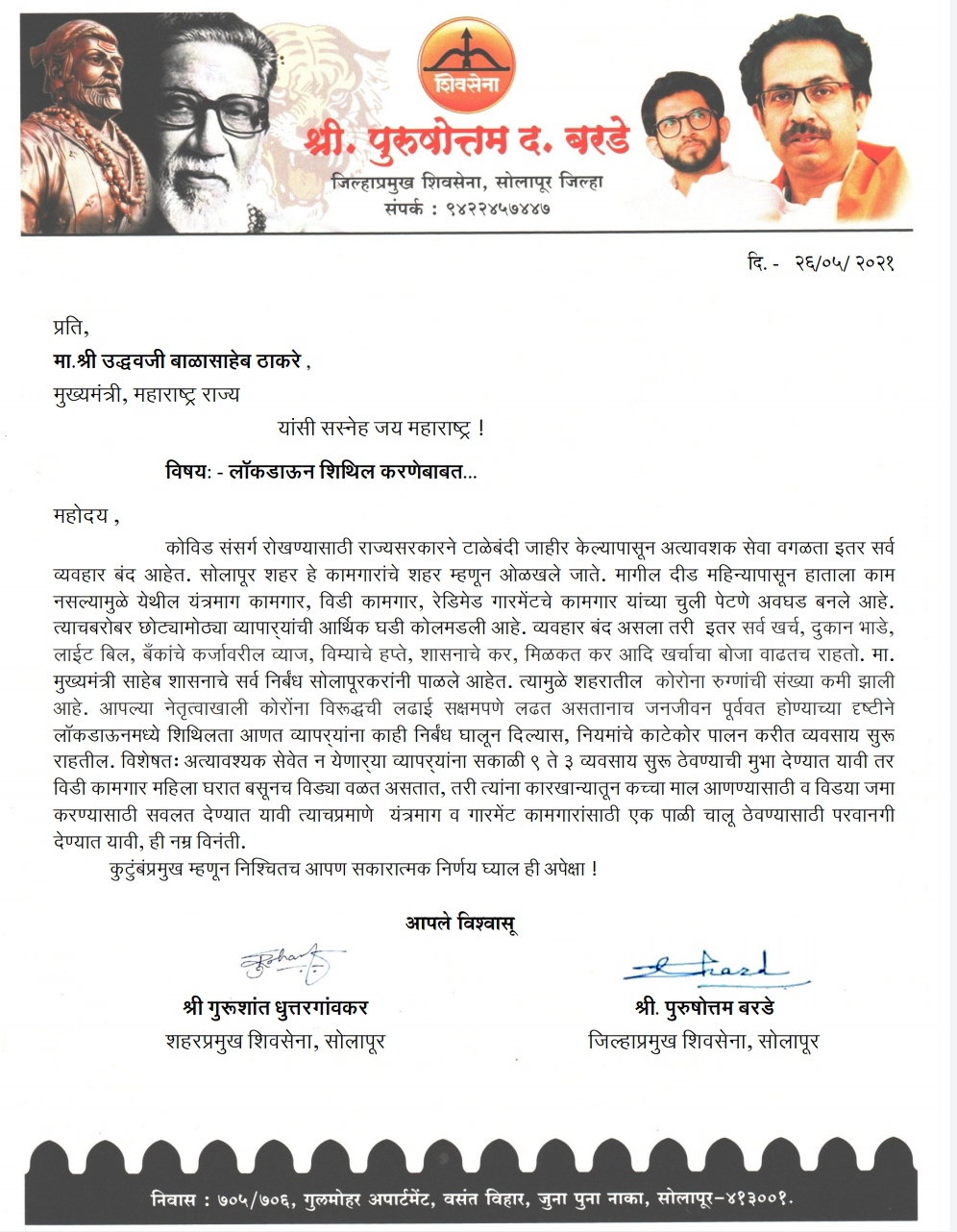 सोलापूर – शहरातील घटती रुग्ण संख्या आणि दिवसेंदिवस कोलमडत चाललेले सर्वसामान्यांसह कामगार व व्यापाऱ्यांचे आर्थिक गणित लक्षात घेऊन १ जूनपासून लॉकडाऊन शिथिल करा अशी मागणी शिवसेनेचे जिल्हाप्रमुख पुरुषोत्तम बरडे व शहरप्रमुख गुरुशांत धुत्तरगांवकर यांनी मुख्यमंत्री उध्दव ठाकरे यांच्याकडे केली आहे.