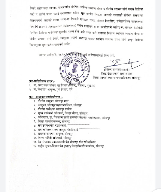 त्याअर्थी, मी मिलिंद शंभरकर, जिल्हादंडाधिकारी, सोलापूर, तथा अध्यक्ष आपत्ती व्यवस्थापन प्राधिकरण सोलापूर मला आपत्ती व्यवस्थापन अधिनियम २००५ अन्वये मला प्राप्त झालेल्या अधिकारानुसार सोलापूर जिल्हयातील (पोलीस आयुक्तालय सोलापूर ची हद्द वगळून) दि. २८.१०.२०२१ पासून सर्व प्रकारचे आठवडा बाजार, जनावरांचा बाजार भरण्यास परवानगी देत आहे.