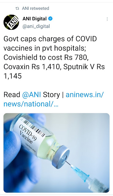 २१ जूनपासून देशात सर्वांचं मोफत लसीकरण करण्यात येणार असल्याची घोषणा पंतप्रधान नरेंद्र मोदींनी केली. सरकारी लसीकरण केंद्रासह खासगी दवाखान्यांमध्येही लस उपलब्ध असणार आहे. नागरिकांची लूट होऊ नये, यासाठी केंद्र सरकारने खासगी रुग्णालयांसाठी कोरोना व्हायरस लसीचे जास्तीत जास्त दर निश्चित केले आहेत.,