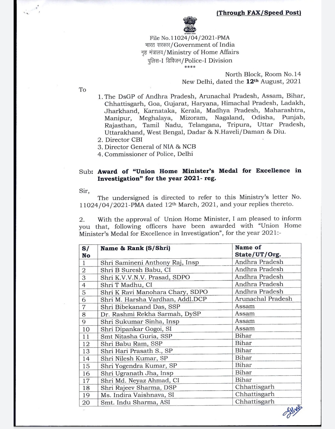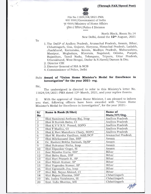 भारत सरकारच्या गृह मंत्रालयाच्या वतीने देशातील 152 पोलिस अधिकाऱ्यांना उत्कृष्ट तपास अधिकारी (Award of “Union Home Minister’s Medal for Excellence in Investigation” for the year 2021-) म्हणून पुरस्कार देऊन गौरवण्यात येणार आहे त्या 152 अधिकाऱ्यांच्या नावांची घोषणा केंद्रीय गृहमंत्रालयाने केली.
