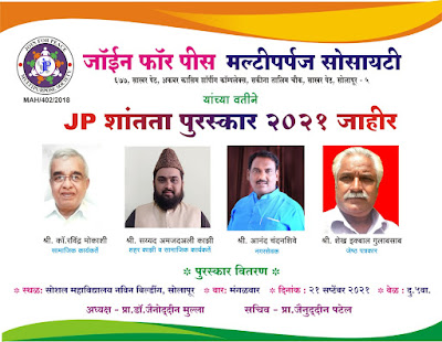 सोलापूर : जॉईन फॉर पीसचे जे.पी. शांतता पुरस्कारासाठी सामाजिक क्षेत्रात कार्यरत असलेल्या चार समाजसेवकांची निवड करण्यात आली आहे. रविंद्र मोकाशी, आनंद चंदनशिवे, अमजदअली काझी आणि इक्बाल शेख यंदाच्या जे.पी. पुरस्काराचे मानकरी असून, जागतिक शांतता दिनी, मंगळवारी, २१ सप्टेंबर २०२१ रोजी सायंकाळी या पुरस्काराचे वितरण होणार असल्याची माहिती जॉईन फॉर पिस मल्टीपर्पज सोसायटीचे अध्यक्ष प्रा. डॉ. जैनोद्दीन मुल्ला आणि सचिव प्रा. जैनोद्दीन पटेल यांनी एका प्रसिध्दीपत्रकान्वये दिली.