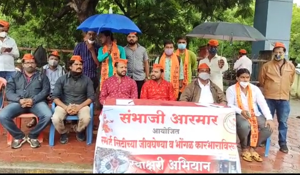 सोलापूर : संभाजी आरमार संघटनेच्यावतीने गुरुवारी जिल्हाधिकारी कार्यालयासमोर स्मार्ट सिटी योजनेच्या जीवघेण्या आणि नियोजनशून्य कारभाराविरोधात नागरिकांचे स्वाक्षरी मोहीम घेण्यात आली,