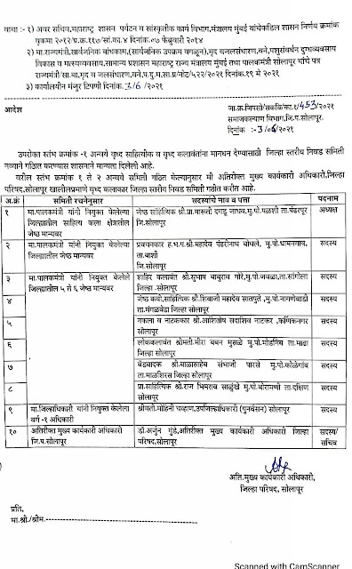 पालकमंत्री दत्तात्रय भरणे यांनी वृद्ध साहित्यिक व वृद्ध कलावंतांना मानधन देण्यासाठी जिल्हास्तरीय समिती गठीत केली आहे, त्या समितीच्या अध्यक्ष पदी जेष्ठ साहित्यिक प्रा. मारूती दगडू जाधव,मु.पो. पळशी ता. पंढरपूर यांची पालकमंत्र्यांनी नियुक्ती केली आहे. समितीचे सचिव हे अतिरिक्त मुख्य कार्यकारी अधिकारी डॉ अर्जुन गुंडे हे आहेत, इतर सदस्यामध्ये प्रवचनकार ह.भ.प.महादेव पंढरीनाथ बोधले, मु.पो. धामनगाव, ता. बार्शी, शाहिर कलावंत सुभाष बाबुराव गोरे, मु. पो. जवळा, ता. सांगोला, जेष्ठ कवी, साहित्यिक शिवाजी महादेव सातपुते, मु. पो. नागणेवाडी,ता.मंगळवेढा, नकला व नाटककार आशितोष सदाशिव नाटकर कर्णिकनगर, सोलापूर, लोककलावंत श्रीमती मीरा बबन मुसळे मु.पो.मोडनिंब ता. माढा, बॅंडवादक बाळासाहेब संभाजी पारसे मु.पो.कोळेगांव ता.माळशिरस, प्रा. साहित्यिक श्री. राज भिमराव साळुंखे मु.पो. बोरामणी ता. दक्षिण सोलापूर व जिल्हाधिकारी यांनी नियुक्त केलेल्या जिल्हा पुनर्वसन अधिकारी मोहिनी चव्हाण हे समितीमध्ये सदस्य आहेत.