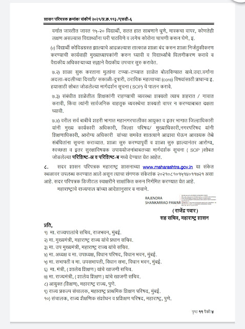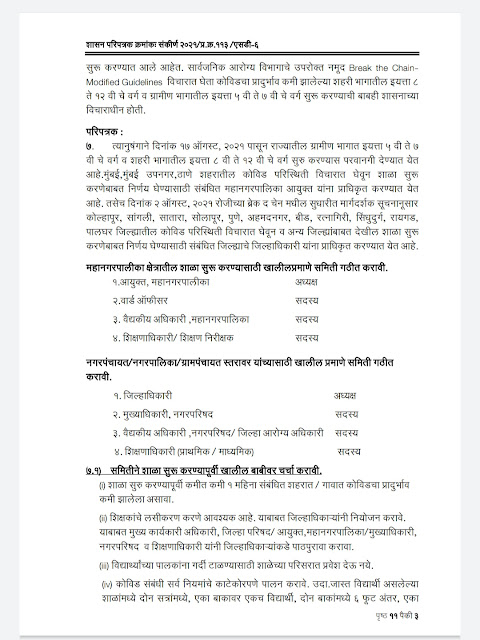 राज्य सरकारने १७ ऑगस्ट, २०२१ पासून राज्यातील ग्रामीण भागात इयत्ता ५ वी ते ७ वी चे वर्ग व शहरी भागातील इयत्ता ८ वी ते १२ वी चे वर्ग सुरु करण्यास परवानगी देण्यात येत आहे. मुंबई, मुंबई उपनगर, ठाणे शहरातील कोविड परिस्थिती विचारात घेवून शाळा सुरू करणेबाबत निर्णय घेण्यासाठी संबंधित महानगरपालिका आयुक्त यांना प्राधिकृत करण्यात येत आहे. तसेच दिनांक २ ऑगस्ट, २०२१ रोजीच्या ब्रेक द चेन मधील सुधारीत मार्गदर्शक सूचनानूसार कोल्हापूर, सांगली, सातारा, सोलापूर, पुणे, अहमदनगर, बीड, रत्नागिरी, सिंधुदुर्ग, रायगड, •पालघर जिल्ह्यातील कोविड परिस्थिती विचारात घेवून व अन्य जिल्ह्यांबाबत देखील शाळा सुरू करणेबाबत निर्णय घेण्यासाठी संबंधित जिल्ह्याचे जिल्हाधिकारी यांना प्राधिकृत करण्यात येत आहे.