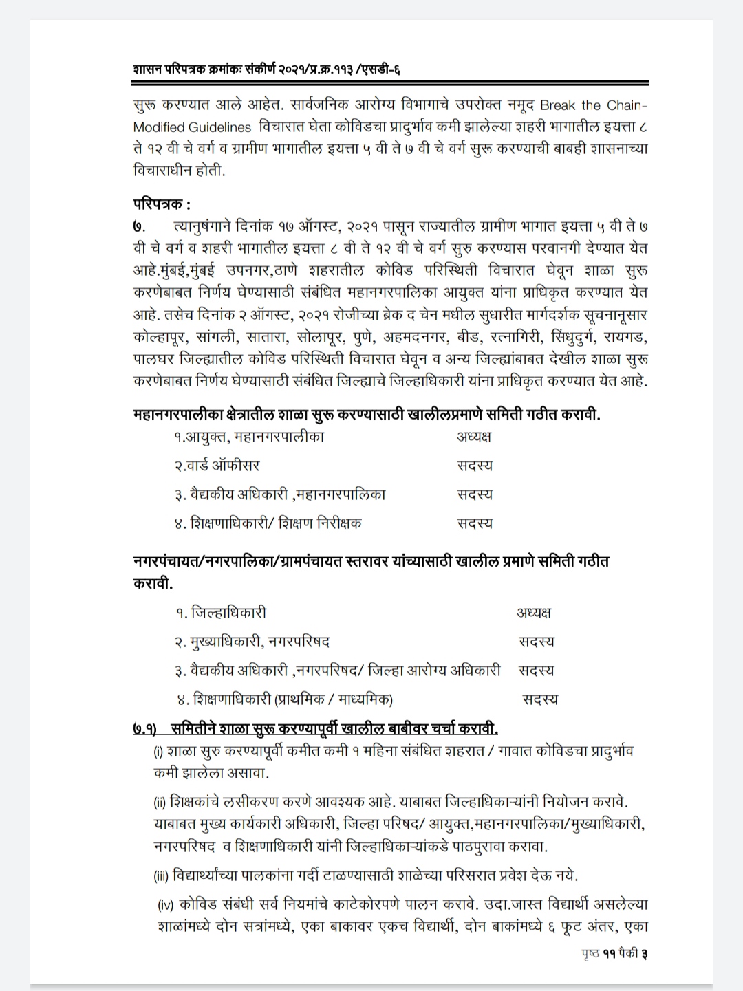 (७.१) समितीने शाळा सुरू करण्यापूर्वी खालील बाबीवर चर्चा करावी. (i) शाळा सुरु करण्यापूर्वी कमीत कमी १ महिना संबंधित शहरात / गावात कोविडचा प्रादुर्भाव कमी झालेला असावा.