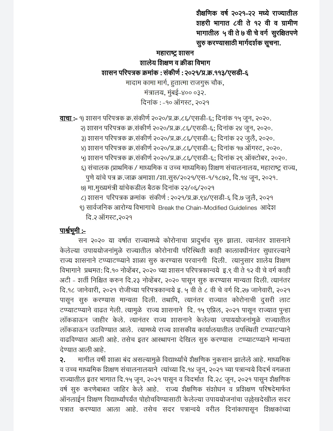 राज्य सरकारने १७ ऑगस्ट, २०२१ पासून राज्यातील ग्रामीण भागात इयत्ता ५ वी ते ७ वी चे वर्ग व शहरी भागातील इयत्ता ८ वी ते १२ वी चे वर्ग सुरु करण्यास परवानगी देण्यात येत आहे. मुंबई, मुंबई उपनगर, ठाणे शहरातील कोविड परिस्थिती विचारात घेवून शाळा सुरू करणेबाबत निर्णय घेण्यासाठी संबंधित महानगरपालिका आयुक्त यांना प्राधिकृत करण्यात येत आहे. तसेच दिनांक २ ऑगस्ट, २०२१ रोजीच्या ब्रेक द चेन मधील सुधारीत मार्गदर्शक सूचनानूसार कोल्हापूर, सांगली, सातारा, सोलापूर, पुणे, अहमदनगर, बीड, रत्नागिरी, सिंधुदुर्ग, रायगड, •पालघर जिल्ह्यातील कोविड परिस्थिती विचारात घेवून व अन्य जिल्ह्यांबाबत देखील शाळा सुरू करणेबाबत निर्णय घेण्यासाठी संबंधित जिल्ह्याचे जिल्हाधिकारी यांना प्राधिकृत करण्यात येत आहे.