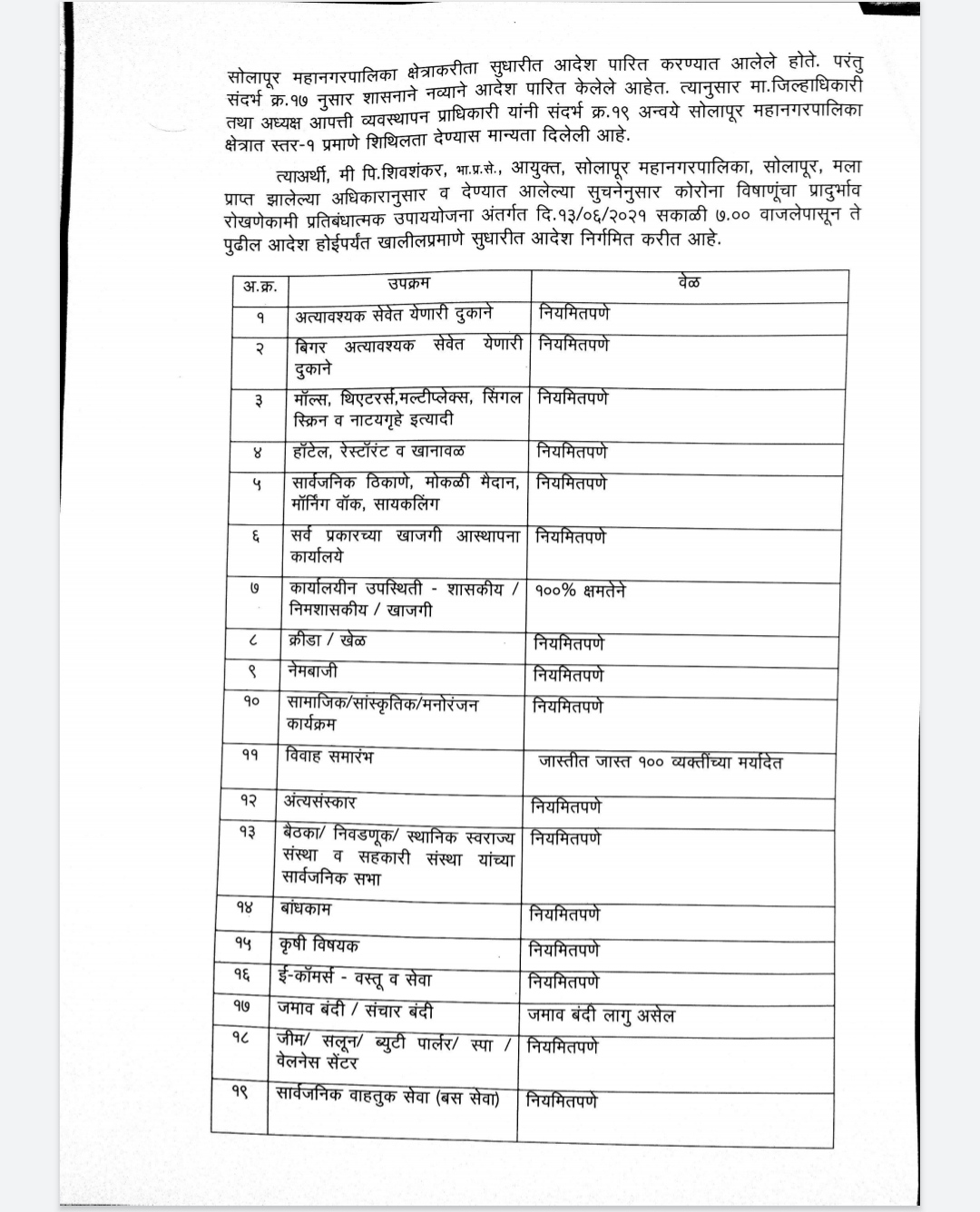 कोरोना विषाणूमुळे उद्भवलेल्या संसर्गजन्य रोगाचा प्रतिबंध व नियंत्रणकामी सोलापूर महानगरपालिका क्षेत्रासाठी आदेश व सर्वसाधारण मार्गदर्शक सूचना त्यांनी केल्या आहेत, यामध्ये सर्वकाही नियमितपणे सुरू राहणार आहे मात्र विवाह समारंभासाठी पन्नासची अट रद्द करून आता शंभर लोकांना परवानगी दिली आहे. शहरात मात्र जमावबंदी लागू असणार आहे, त्याचबरोबर राज्य शासनाने जे टप्पे घालून दिले आहेत त्या पाचव्या टप्प्यांमध्ये जो शहर समाविष्ट आहे त्यातून सोलापुरात येणाऱ्यांसाठी ई पास बंधनकारक करण्यात आला आहे. शासकीय कार्यालयातील उपस्थिती शंभर टक्के करण्यात आली आहे. अंत्यसंस्कारासाठी सुद्धा गर्दीचे निर्बंध हटवण्यात आले आहेत अंत्यसंस्काराला मर्यादा घालून दिली गेली नाही. शहरातील व्यावसायिक दुकानदार उद्योजक यांना rt-pcr रॅपिड टेस्ट याचे प्रमाणपत्र बंधनकारक आहे. ब्युटी पार्लर, सलून, स्पा,जिम हे नियमितपणे सुरू करण्यास परवानगी देण्यात आली आहे.