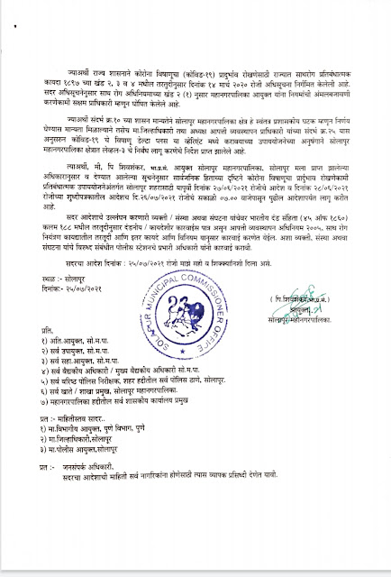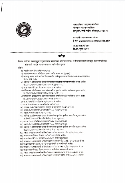 त्याअर्थी, मी, पि शिवशंकर, भा.प्र.से. आयुक्त सोलापूर महानगरपालिका, सोलापूर मला प्राप्त झालेल्या अधिकारानुसार व देण्यात आलेल्या सूचनेनुसार सार्वजनिक हिताच्या दृष्टिने कोरोना विषाणूचा प्रार्दुभाव रोखणेकामी प्रतिबंधात्मक उपाययोजने अंतर्गत सोलापूर शहरासाठी यापूर्वी दिनांक २७/०६/२०२१ रोजीचे आदेश व दिनांक २८/०६/२०२१ रोजीच्या शुध्दीपत्रकातील आदेशच दि. २६/०७/२०२१ रोजीचे सकाळी ०७.०० वाजेपासून पुढील आदेशापर्यंत लागू करीत आहे.