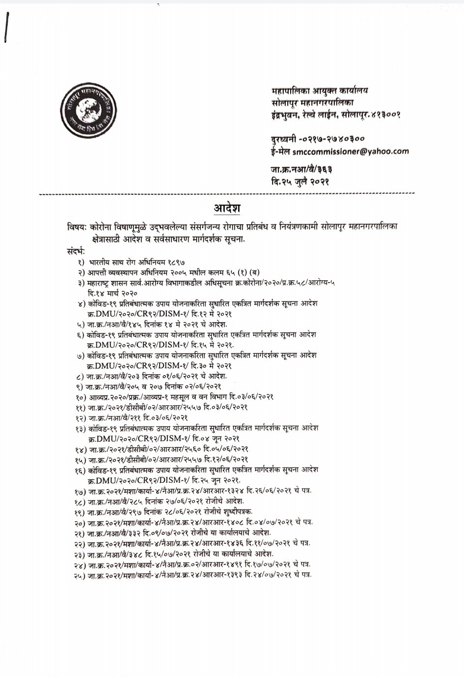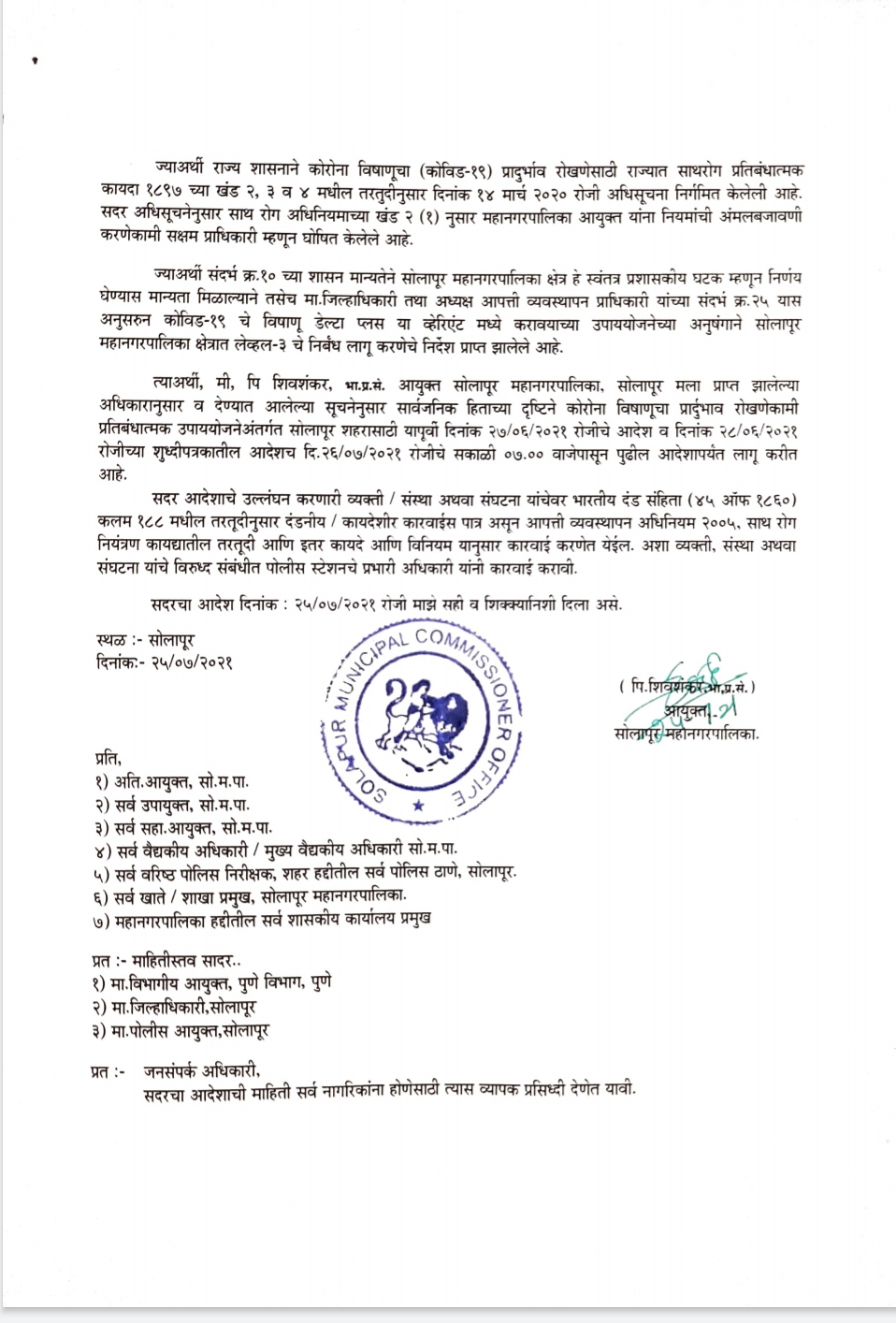 त्याअर्थी, मी, पि शिवशंकर, भा.प्र.से. आयुक्त सोलापूर महानगरपालिका, सोलापूर मला प्राप्त झालेल्या अधिकारानुसार व देण्यात आलेल्या सूचनेनुसार सार्वजनिक हिताच्या दृष्टिने कोरोना विषाणूचा प्रार्दुभाव रोखणेकामी प्रतिबंधात्मक उपाययोजने अंतर्गत सोलापूर शहरासाठी यापूर्वी दिनांक २७/०६/२०२१ रोजीचे आदेश व दिनांक २८/०६/२०२१ रोजीच्या शुध्दीपत्रकातील आदेशच दि. २६/०७/२०२१ रोजीचे सकाळी ०७.०० वाजेपासून पुढील आदेशापर्यंत लागू करीत आहे.