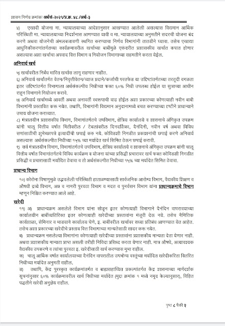 शासन निर्णय : कोविड-१९ च्या संसर्गजन्य रोगाच्या प्रादूर्भावामुळे सन २०२१-२२ या वित्तीय वर्षात राज्याची कर व करेतर उत्पन्नातील अपेक्षित महसूली घट व त्याचे राज्याच्या वित्तियव्यवस्थेवर होणारे परिणाम विचारात घेऊन पुढीलप्रमाणे उपाययोजना करण्याचा निर्णय घेतला आहे.