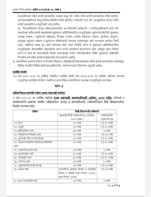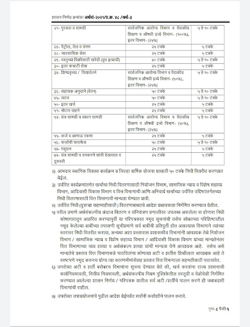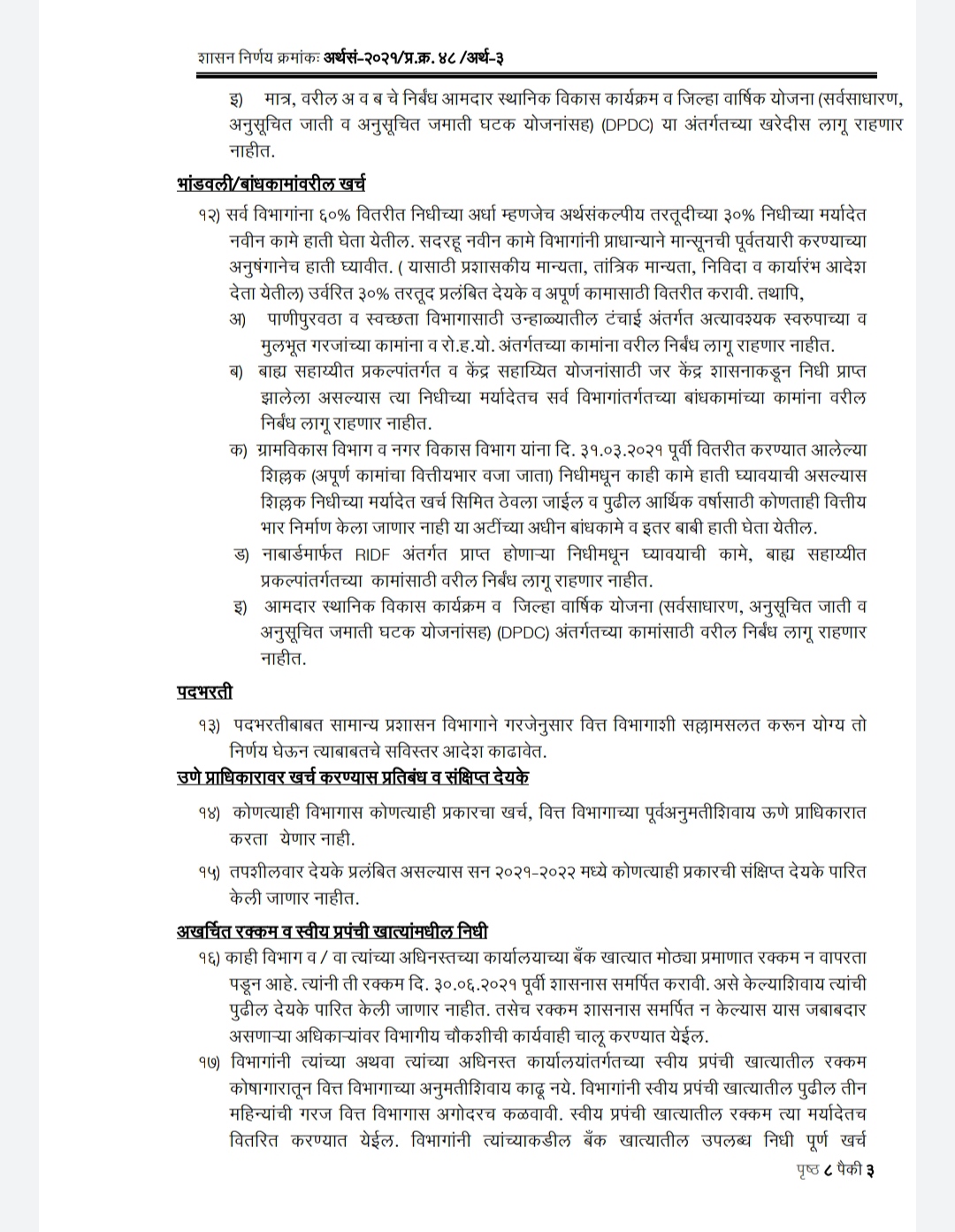 शासन निर्णय : कोविड-१९ च्या संसर्गजन्य रोगाच्या प्रादूर्भावामुळे सन २०२१-२२ या वित्तीय वर्षात राज्याची कर व करेतर उत्पन्नातील अपेक्षित महसूली घट व त्याचे राज्याच्या वित्तियव्यवस्थेवर होणारे परिणाम विचारात घेऊन पुढीलप्रमाणे उपाययोजना करण्याचा निर्णय घेतला आहे.