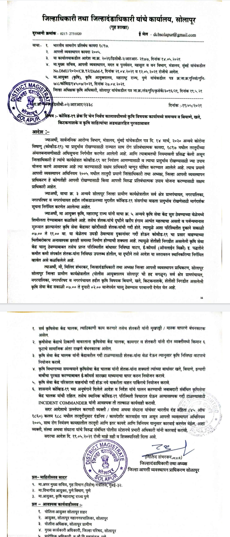सोलापूर शहर हद्द वगळून ग्रामीण भागातील सर्व ग्रामपंचायत ,नगरपालिका ,नगरपरिषद व नगरपंचायत हद्दीत कृषी विषयक बियाणे, खते, कीटकनाशके, शेतीशी निगडित असलेली कृषी सेवा केंद्र हे आता यापुढे सकाळी सात ते दुपारी दोन वाजेपर्यंत चालू ठेवण्यास परवानगी देण्यात आली आहे, सर्व कृषी सेवा, केंद्र चालक या ठिकाणी काम करणारे तसेच शेतकरी यांनी मुख्यपट्टी बांधणे बंधनकारक असेल,