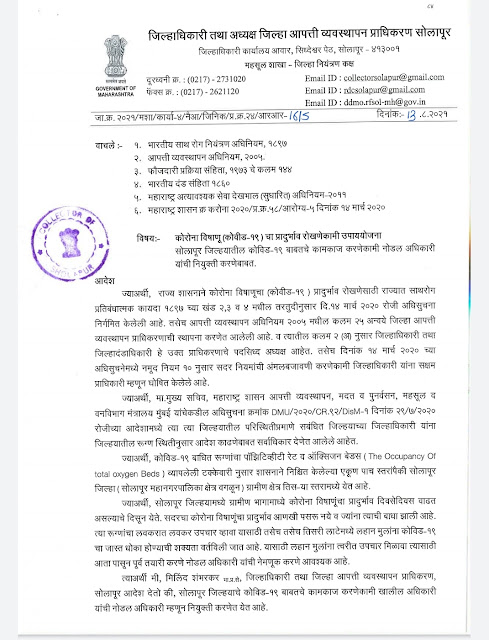 सोलापूर जिल्हयाचे कोविड १९ बाबतचे कामकाज करणेकामी उपजिल्हाधिकारी भारत वाघमारे यांची नोडल अधिकारी म्हणून नियुक्ती करणेत येत आहे. असे आदेश जिल्हाधिकारी मिलिंद शंभरकर यांनी काढले आहेत.