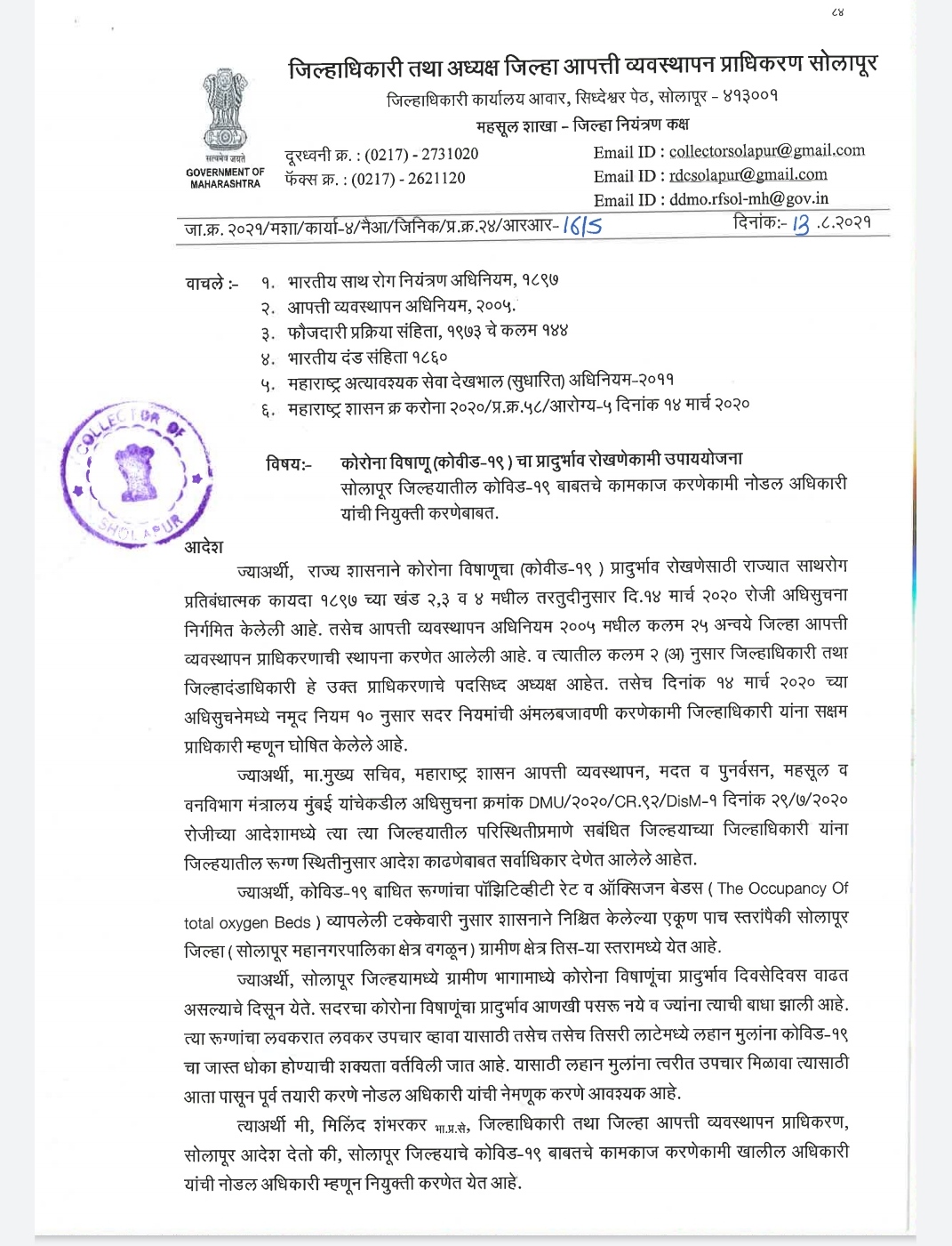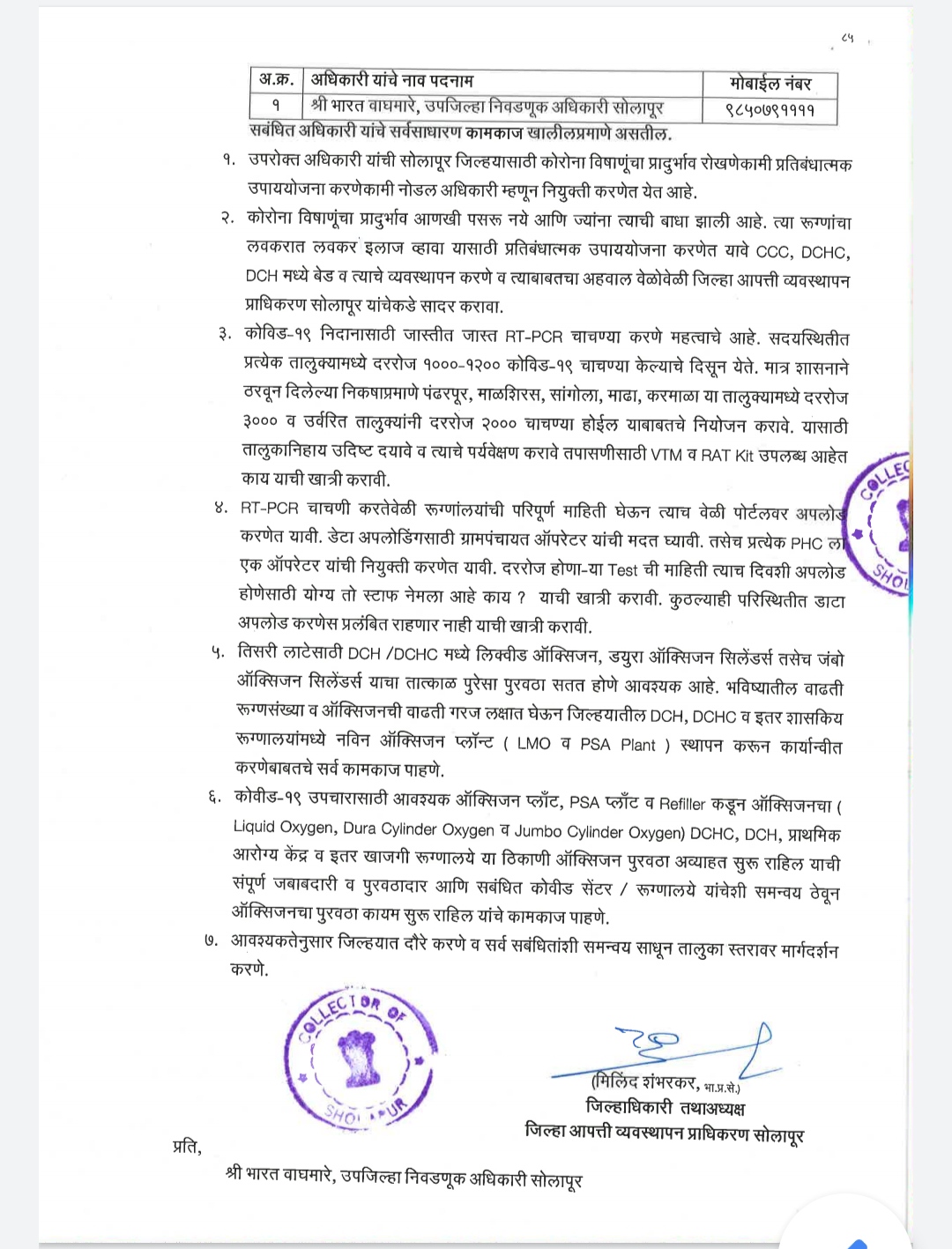 सोलापूर जिल्हयाचे कोविड १९ बाबतचे कामकाज करणेकामी उपजिल्हाधिकारी भारत वाघमारे यांची नोडल अधिकारी म्हणून नियुक्ती करणेत येत आहे. असे आदेश जिल्हाधिकारी मिलिंद शंभरकर यांनी काढले आहेत.