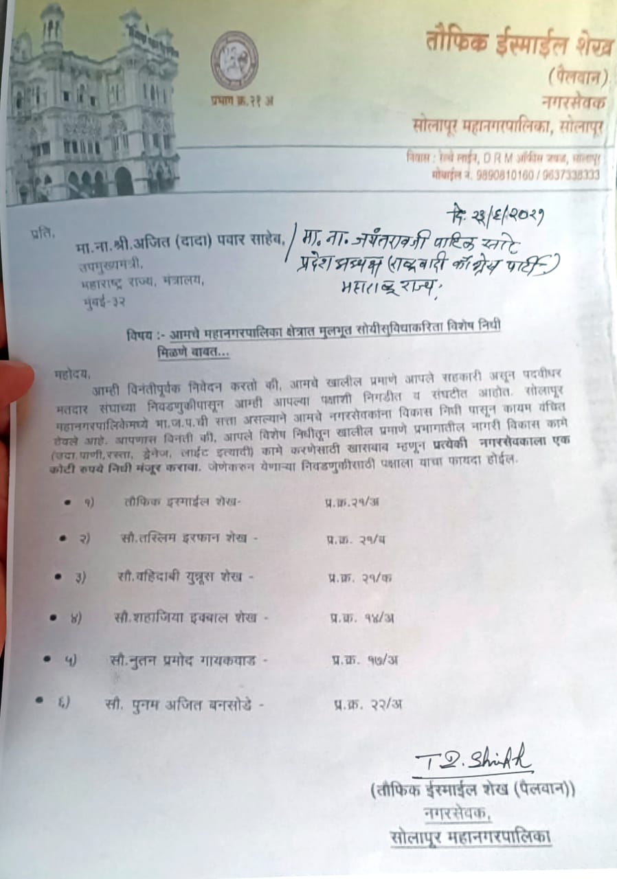 यामध्ये प्रभाग 21, प्रभाग 14, प्रभाग  17 व प्रभाग 22 मध्ये विशेष निधी देण्याची मागणी त्यांनी केली आहे, यानंतर झालेल्या चर्चेत जयंत पाटील यांनी उपमुख्यमंत्री अजित दादा यांना बोलून निधी देऊ असे आश्वासन दिले. त्याचबरोबर जुलै महिन्यात सोलापूर जिल्ह्याचा दौरा असून त्या वेळी तुमच्या सर्व कार्यकर्त्यांची बैठक घेऊन चर्चा करू असे सांगण्यात आले, त्यामुळे येणाऱ्या जुलै महिन्यात तौफिक पैलवान यांचा राष्ट्रवादी प्रवेशाचा बार निश्चितच उडण्याची शक्यता आहे.