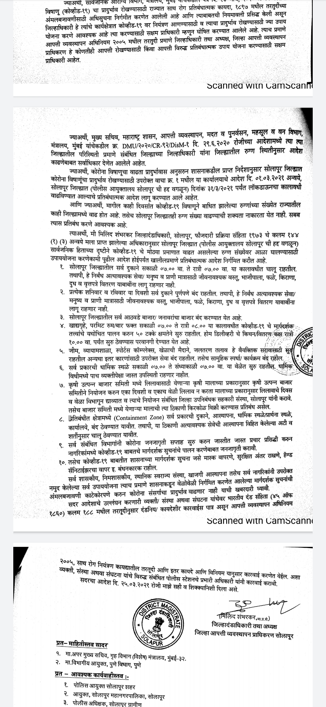 सोलापूर शहरात सध्या कोरोना रुग्णाची झपाट्याने वाढ होत आहे गुरुवारी तर तब्बल 500 हून अधिक कोरोनाचे रुग्ण शहर आणि जिल्ह्यात सापडले या पार्श्वभूमीवर जिल्ह्यात लॉकडाऊन लागणार का अशी चर्चा काय माहिती मिळत आहे मात्र पंढरपूर विधानसभा पोटनिवडणूक पाहता प्रशासनाला हा निर्णय अद्याप तरी घेता येणार नाही असे चित्र आहे परंतु सोलापूर जिल्ह्यातील निर्बंध अजून कडक केले आहेत जिल्ह्यातील सर्व दुकाने सकाळी सात ते सायंकाळी 7 पर्यंतच सुरू राहतील हॉटेल परमिट रूम बियर बार हे सायंकाळी आठला बंद होतील. विशेष म्हणजे शनिवार आणि रविवारी सर्व दुकाने बंद ठेवण्याचा निर्णय झाला आहे अत्यावश्यक वस्तू मेडिकल किराणा दुकाने भाजीपाला हे मात्र शनिवार-रविवार सुरू राहील, आठवडी बाजार पूर्णपणे बंद करण्याचा निर्णय झाला आहे जिल्हाधिकारी यांनी काढलेल्या या आदेशात कोणकोणते निर्णय घेण्यात आले आहेत ते पहा.