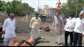 सोलापुरात मराठा समाज आणि शिवभक्त यांच्या वतीनं छत्रपती संभाजी महाराज यांच्या विषयी वादग्रस्त लिखान करणाऱ्या गिरीश कुबेरच्या पुतळ्याचे दहन करण्यात आले.