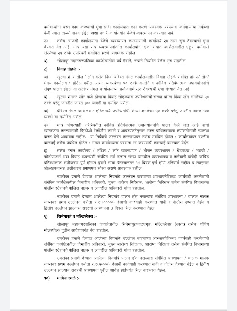 अ खुल्या प्रांगणातील / लॉन वरील किंवा बंदिस्त मंगल कार्यालयातील विवाह सोहळे संबंधित प्रांगण / लॉन/ मंगल कार्यालय / हॉटेल मधील आसन व्यवस्थेच्या ५० टक्के क्षमतेने व कोविड प्रतिबंधात्मक उपाययोजनांचे संपूर्ण पालन होईल या अटीवर मंगल कार्यालयाच्या प्रयोजनार्थ सुरु ठेवण्याची मुभा देण्यात येत आहे. खुल्या प्रांगण / लॉन मध्ये होणाऱ्या विवाह सोहळ्यास उपस्थितांची संख्या प्रांगण किंवा लॉन क्षमतेच्या ५० टक्के परंतू जास्तीत जास्त २०० व्यक्ती या मर्यादेत असेल.