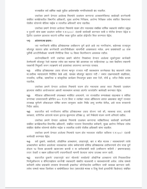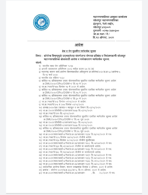 मा. जिल्हाधिकारी तथा अध्यक्ष आपत्ती व्यवस्थापन प्राधिकारी यांच्या संदर्भ क्र.३० यास अनुसरुन कोविड़ १९ चे विषाणू चा प्रादुर्भाव रोखणेकामी करावयाच्या उपाययोजनेच्या अनुषंगाने सोलापूर महानगरपालिका क्षेत्रात ब्रेक द चेन सुधारित मार्गदर्शक सूचना लागू करणेचे निर्देश प्राप्त झालेले आहे.