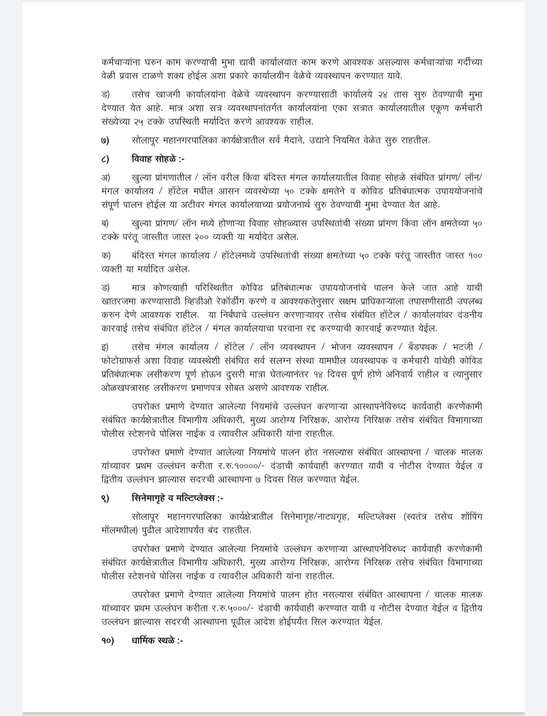 अ खुल्या प्रांगणातील / लॉन वरील किंवा बंदिस्त मंगल कार्यालयातील विवाह सोहळे संबंधित प्रांगण / लॉन/ मंगल कार्यालय / हॉटेल मधील आसन व्यवस्थेच्या ५० टक्के क्षमतेने व कोविड प्रतिबंधात्मक उपाययोजनांचे संपूर्ण पालन होईल या अटीवर मंगल कार्यालयाच्या प्रयोजनार्थ सुरु ठेवण्याची मुभा देण्यात येत आहे. खुल्या प्रांगण / लॉन मध्ये होणाऱ्या विवाह सोहळ्यास उपस्थितांची संख्या प्रांगण किंवा लॉन क्षमतेच्या ५० टक्के परंतू जास्तीत जास्त २०० व्यक्ती या मर्यादेत असेल.
