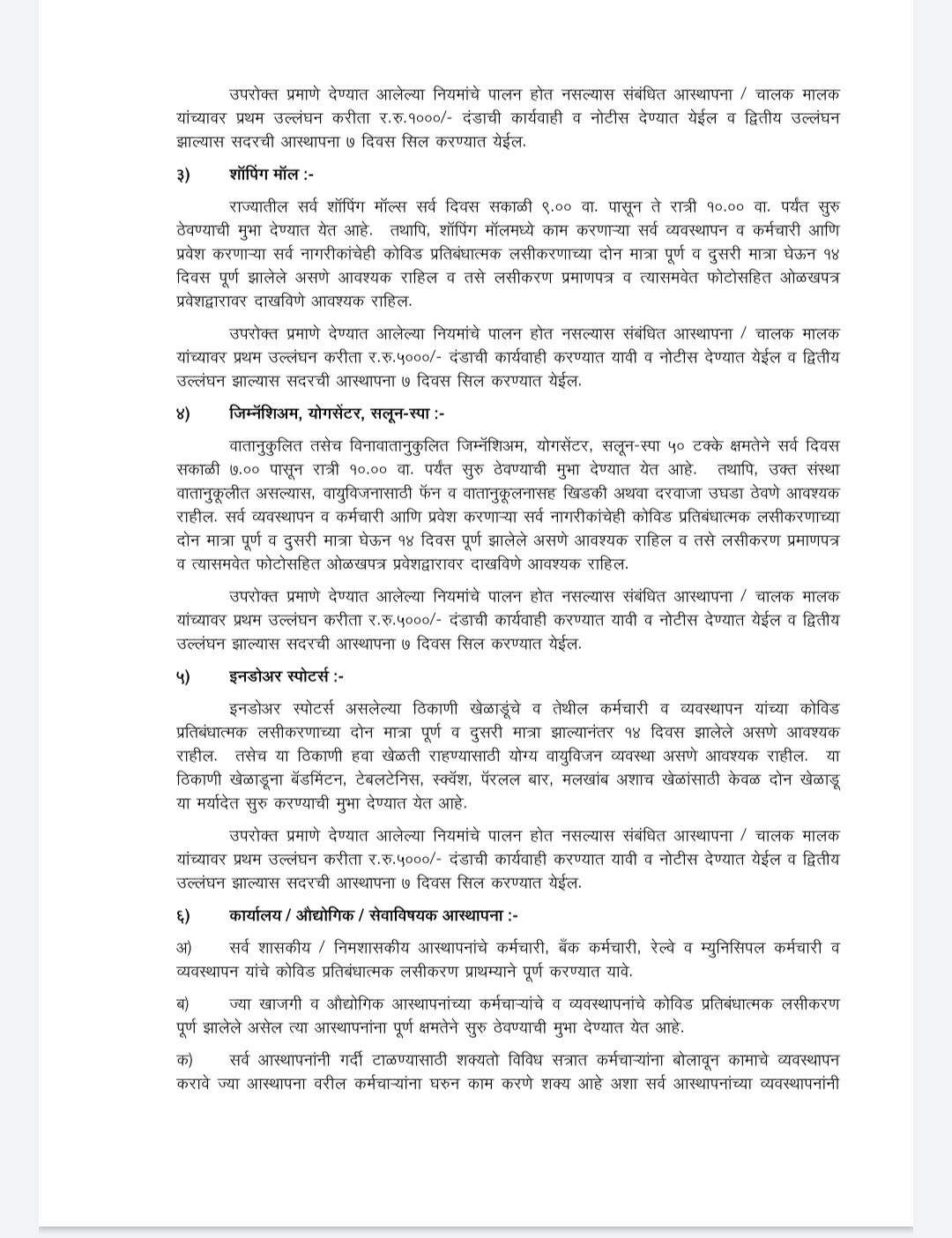 राज्यातील सर्व व्यापारी दुकाने सर्व दिवस सकाळी ७.०० पासून रात्री १०.०० वा. पर्यंत सुरु ठेवण्याची मुभा देण्यात येत आहे. दुकानात काम करणाऱ्या सर्व व्यवस्थापन व कर्मचाऱ्यांचे कोविड प्रतिबंधात्मक लसीकरणाचे दोन मात्रा पुर्ण व दुसरी मात्रा झाल्यानंतर १४ दिवसाचा कालावधी पूर्ण होणे आवश्यक राहिल.