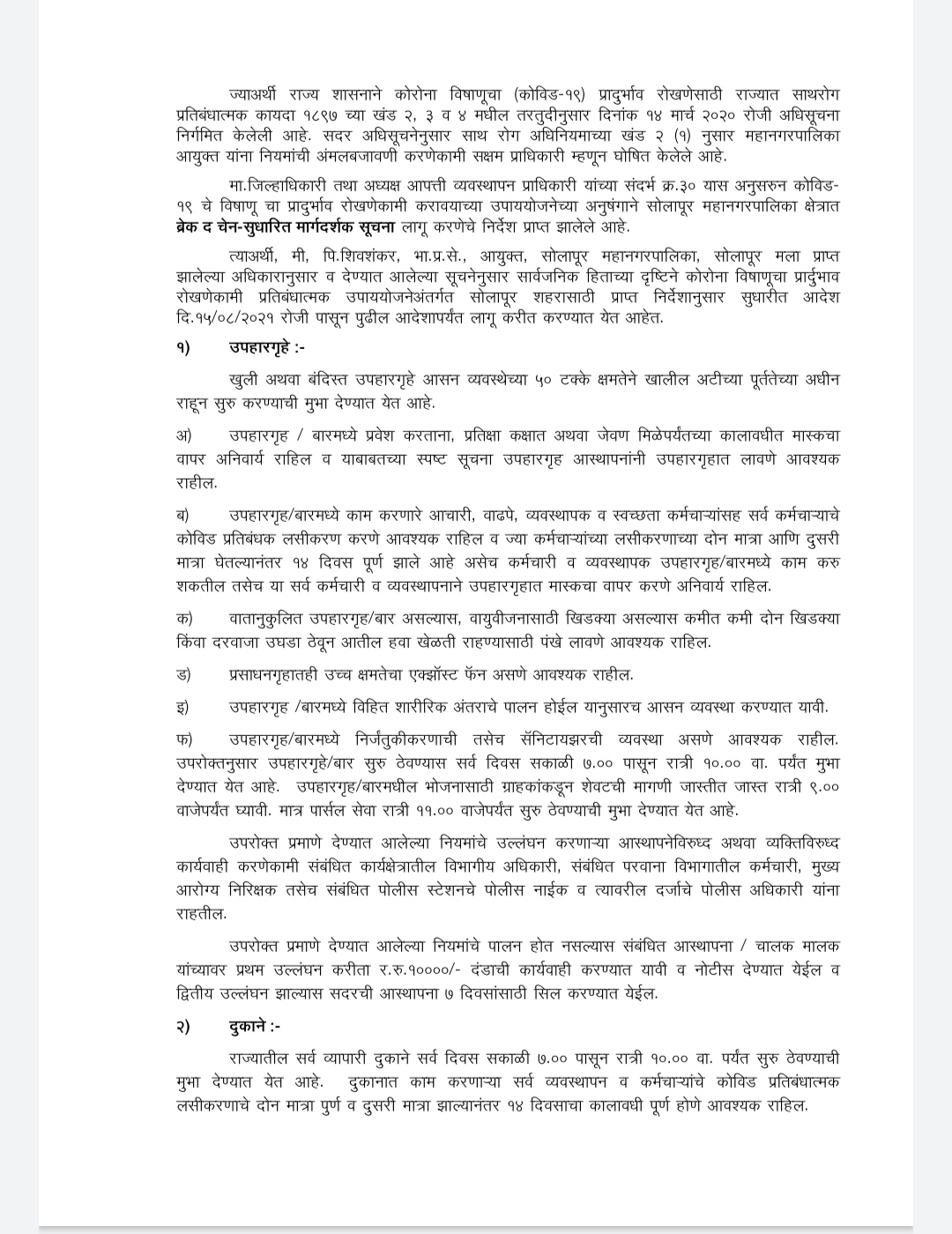 त्याअर्थी, मी, पि. शिवशंकर, भा.प्र.से., आयुक्त, सोलापूर महानगरपालिका, सोलापूर मला प्राप्त झालेल्या अधिकारानुसार व देण्यात आलेल्या सूचनेनुसार सार्वजनिक हिताच्या दृष्टिने कोरोना विषाणूचा प्रार्दुभाव रोखणेकामी प्रतिबंधात्मक उपाययोजनेअंतर्गत सोलापूर शहरासाठी प्राप्त निर्देशानुसार सुधारीत आदेश दि. १५/०८/२०२१ रोजी पासून पुढील आदेशापर्यंत लागू करीत करण्यात येत आहेत.