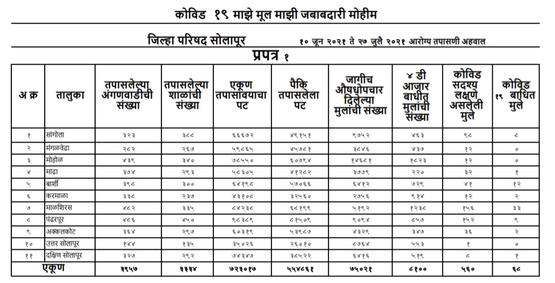 तसेच 560 मुले कोरोना सदृष्य आजाराची लक्षणे असून 8 हजार 100 मुले विविध आजाराने बाधित असल्याचं तपासणीमध्ये निदर्शनास आले त्यापैकी 75 हजार बालकांवर जागीच औषधोपचार करण्यात आले आहेत, अद्याप 7 लाख 23 हजार मुलांची तपासणी बाकी आहे. सोलापूर जिल्ह्या मधील 3957 अंगणवाडी तर 3334 शाळांमध्ये बालकांची तपासणी करण्यात आली आहे.त्यामध्ये