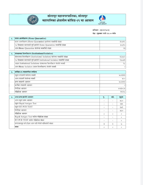 त्याला कारण ही तितकेच महत्त्वाचे आहे, या दिवशी सोलापूर शहरात 480 कोरोनाच्या चाचण्या झाल्या मात्र यामध्ये एकही कोरोना पॉझिटिव्ह रुग्ण आढळला नाही तसेच एकही मृत्यू झालेला नाही ही फारच आनंदाची बाब म्हणावी लागेल. शनिवारच्या रिपोर्टवर समाधान न मानता अजूनही कोरूनाचा संसर्ग संपलेला नाही त्यामुळे काळजी घेणे महत्त्वाचे आहे. सोशल डिस्टन्स तोंडावर मास्क हॅन्ड सॅनिटायझरचा वापर हा गरजेचा आहे.