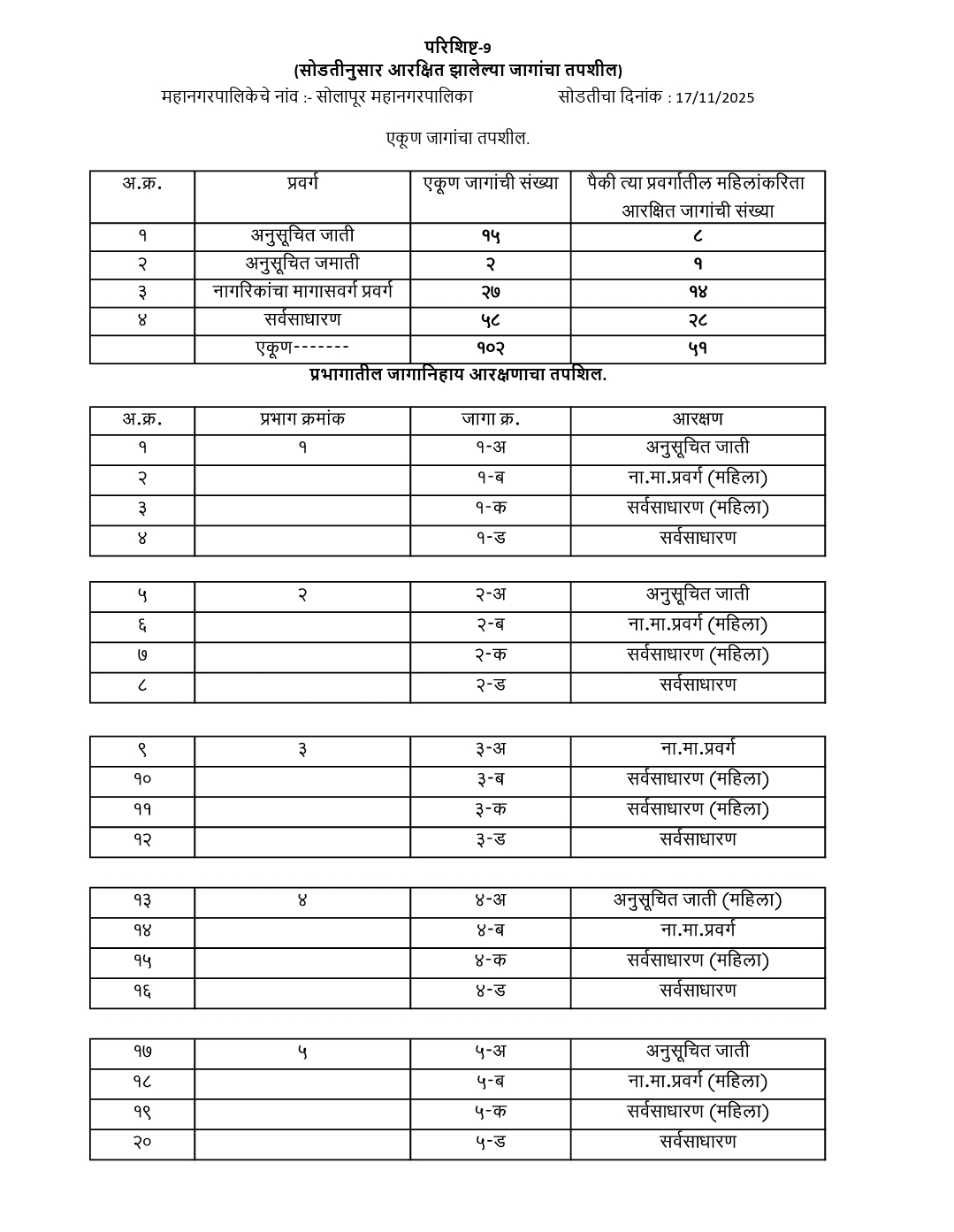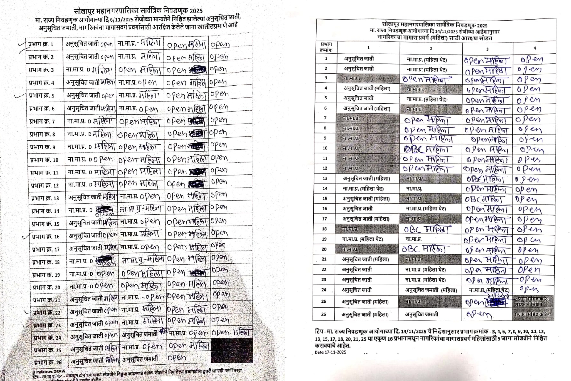 राज्य निवडणूक आयोगाच्या दि. 14/11/2025 चे निर्देशानुसार प्रभाग क्रमांक 3.4.6.7.8.9. 10, 11, 12, 13, 15, 17, 18, 20, 21, 25 या एकूण 16 प्रभागामधून नागरिकांचा मागासप्रवर्ग महिलांसाठी 5 जागा सोडतीने निश्चित करण्यात आल्या त्यात प्रभाग 20, 10, 18, 15, 13 हे पाच थेट महिलेसाठी आरक्षित झाले.