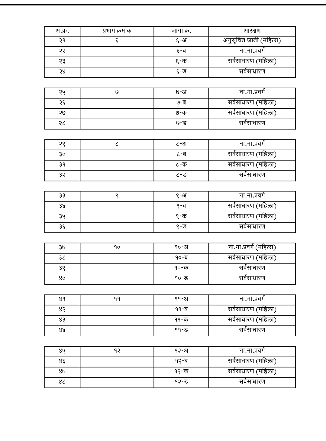 अशाप्रकारे, प्रभाग क्र. 24, 14, 19, 1, 2, 5, 16, 22, 23 हे एकूण 9 प्रभाग नागरिकांचा मागासप्रवर्ग महिलाकरिता थेट आरक्षित झालेले आहे.