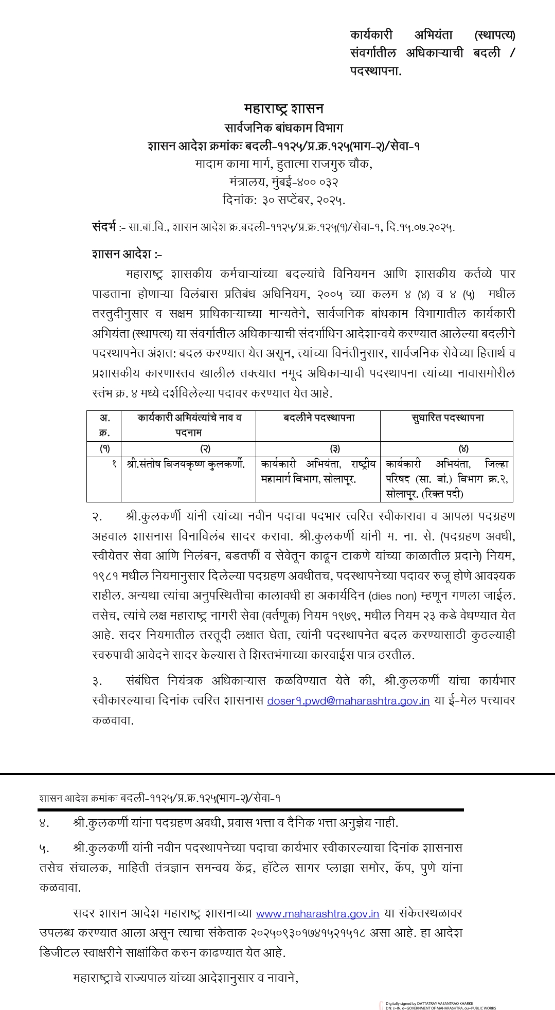 सोलापूर : सोलापूर जिल्हा परिषदेमधून बदली झालेले कार्यकारी अभियंता संतोष कुलकर्णी यांची पुन्हा सोलापूर जिल्हा परिषदेमध्येच नियुक्ती झाली आहे. कुलकर्णी यांना सोलापूर जिल्हा परिषद कार्यकारी अभियंता क्रमांक दोन या पदावरच पुन्हा नियुक्ती देण्यात आली असून तसे पत्र 30 सप्टेंबर 2025 रोजी प्राप्त झाले.