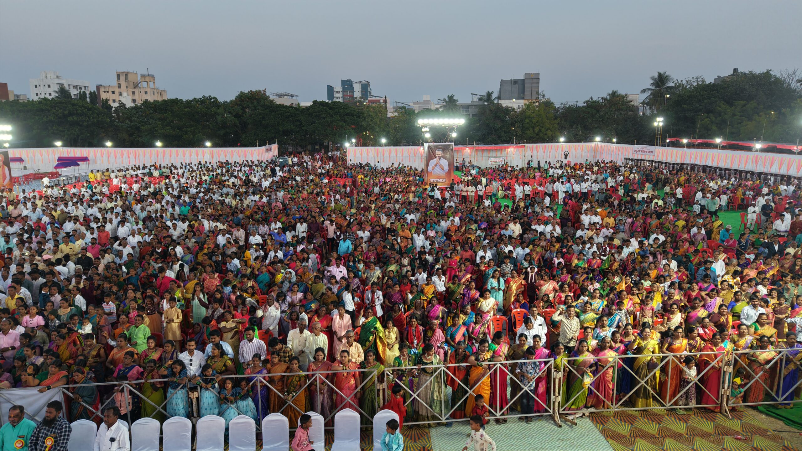 सोलापूर : गोरज मुहूर्तावरची लगबग….मंगलवाद्यांचे सूर…आणि अनुपम्य असा सोहळा ‘याची देही याची डोळा’ पाहण्यासाठी जमलेले हजारो वऱ्हाडी अशा वातावरणात बुधवारी स्व. विष्णूपंत कोठे प्रतिष्ठानतर्फे २६ जोडप्यांचा मोफत सर्वधर्मीय सामुदायिक विवाह सोहळा अत्यंत आनंदी वातावरणात झाला. लिंगराज वल्याळ मैदानावर झालेल्या या सामुदायिक विवाह सोहळ्यास सोलापूर जिल्ह्याचे पालकमंत्री जयकुमार गोरे, संयोजक आमदार देवेंद्र कोठे, सोलापूर महानगरपालिकेचे आयुक्त डॉ. सचिन ओंबासे, पोलीस आयुक्त एम. राजकुमार, पोलिस उपायुक्त विजय कबाडे यांची प्रमुख उपस्थिती होती.