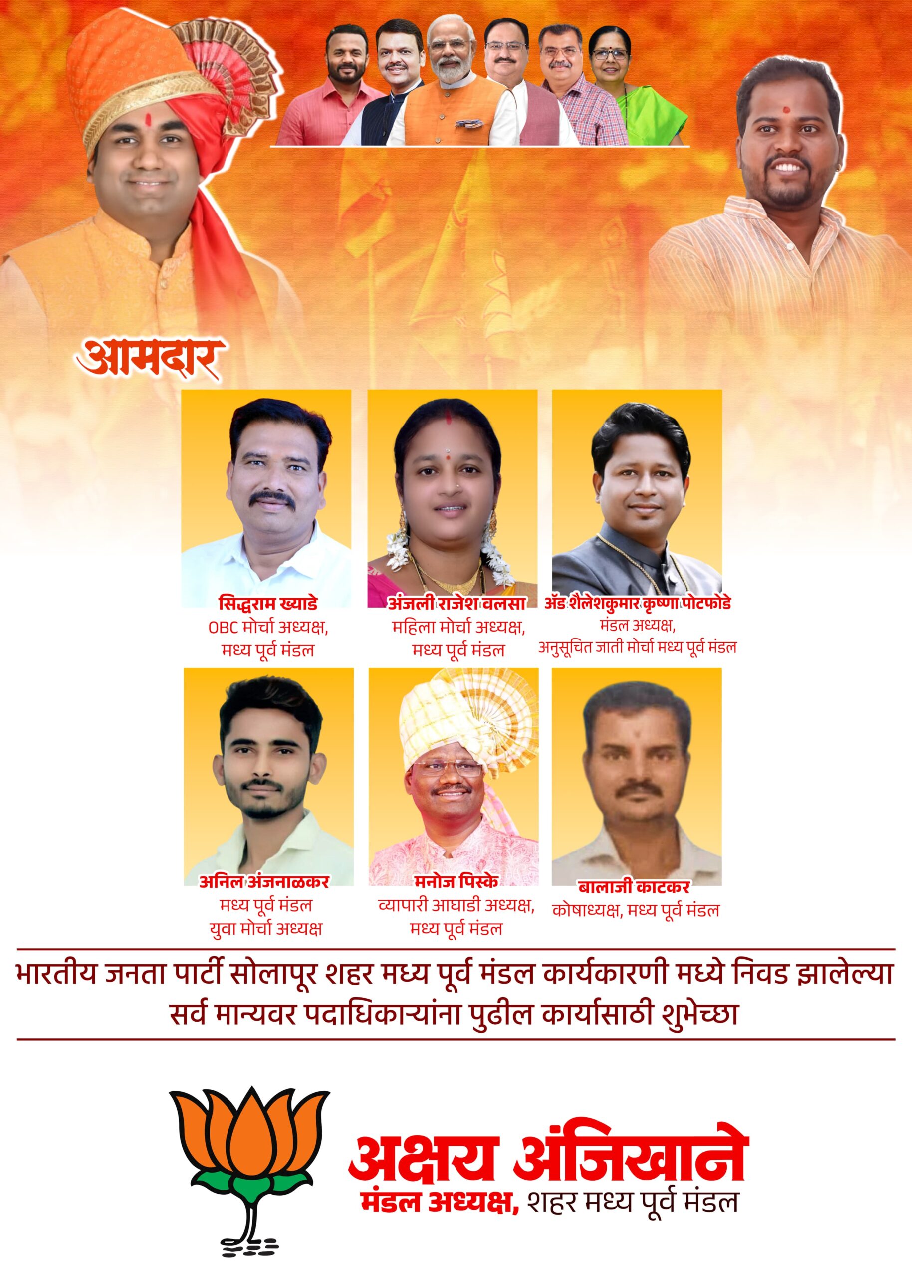 मध्य पूर्व मंडलाच्या ओबीसी मोर्चा मंडल अध्यक्षपदी सिद्धराम ख्याडे, युवा मोर्चा अध्यक्षपदी अनिल अंजनाळकर, अनुसूचित जाती मोर्चा अध्यक्षपदी ॲड. शैलेश पोटफोडे, महिला मोर्चा अध्यक्षपदी अंजली वलसा, व्यापारी आघाडी अध्यक्षपदी मनोज पिस्के यांची नियुक्ती करण्यात आली.