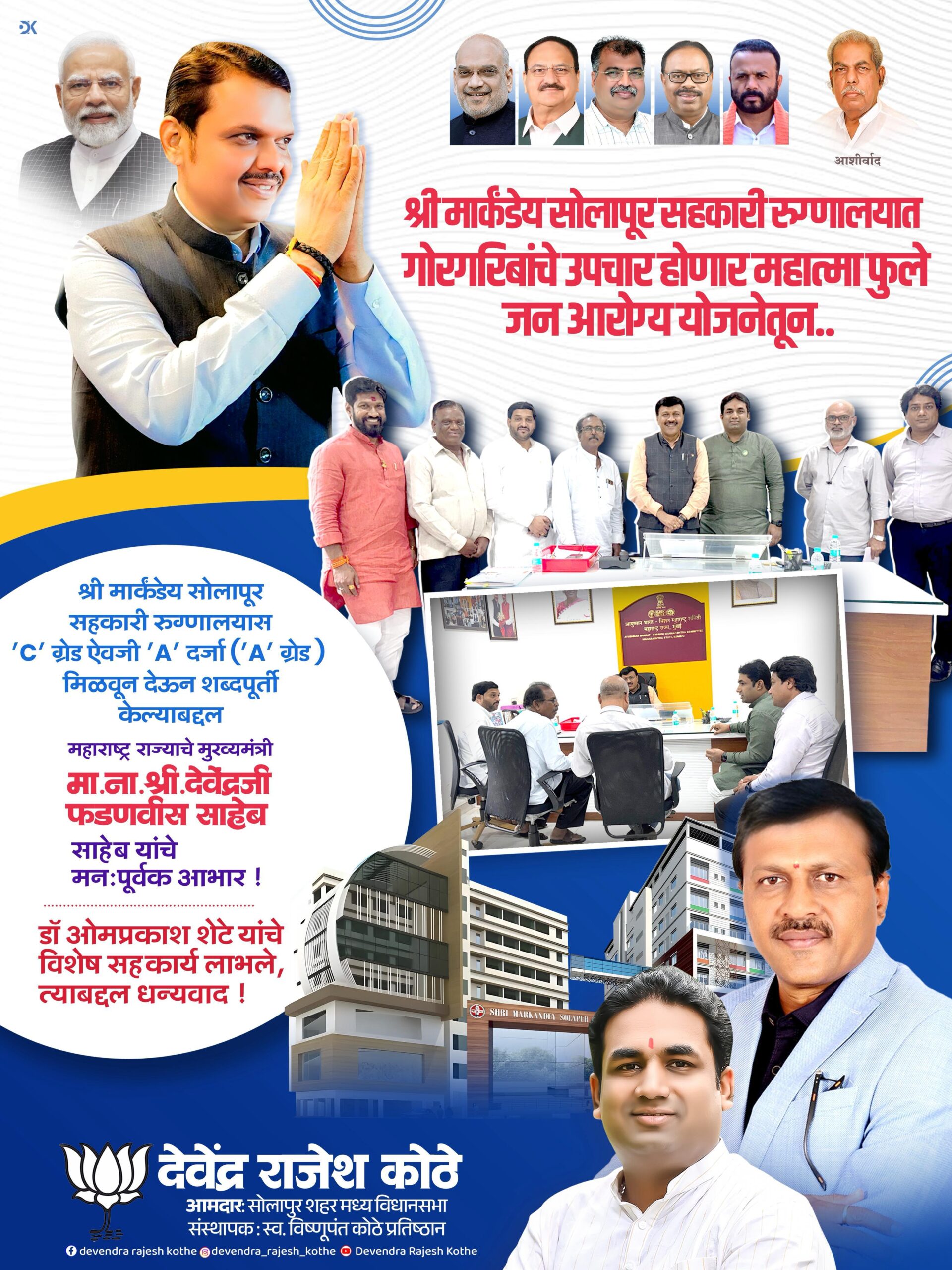 मुख्यमंत्री देवेंद्र फडणवीस यांनी एखादा शब्द दिला की ते पूर्ण करतातच अशी त्यांची महाराष्ट्रभर ख्याती आहे. सोलापूरकरांच्या मागण्या मांडल्यानंतर मुख्यमंत्री देवेंद्र फडणवीस यांनी श्री मार्कंडेय सोलापूर सहकारी रुग्णालयाचा दर्जा क वरून अ केल्याबद्दल मुख्यमंत्री देवेंद्र फडणवीस यांचे त्रिवार आभार. महाराष्ट्र राज्याचे मुख्यमंत्री हे शब्द पाळणारे मुख्यमंत्री आहेत हे पुन्हा एकदा सिद्ध झाले आहे. सोलापूरचे सुपुत्र असलेले डॉ. ओमप्रकाश शेटे यांचेही याकामी विशेष सहकार्य लाभल्याबद्दल त्यांचेही समस्त सोलापूरकरांतर्फे विशेष आभार.