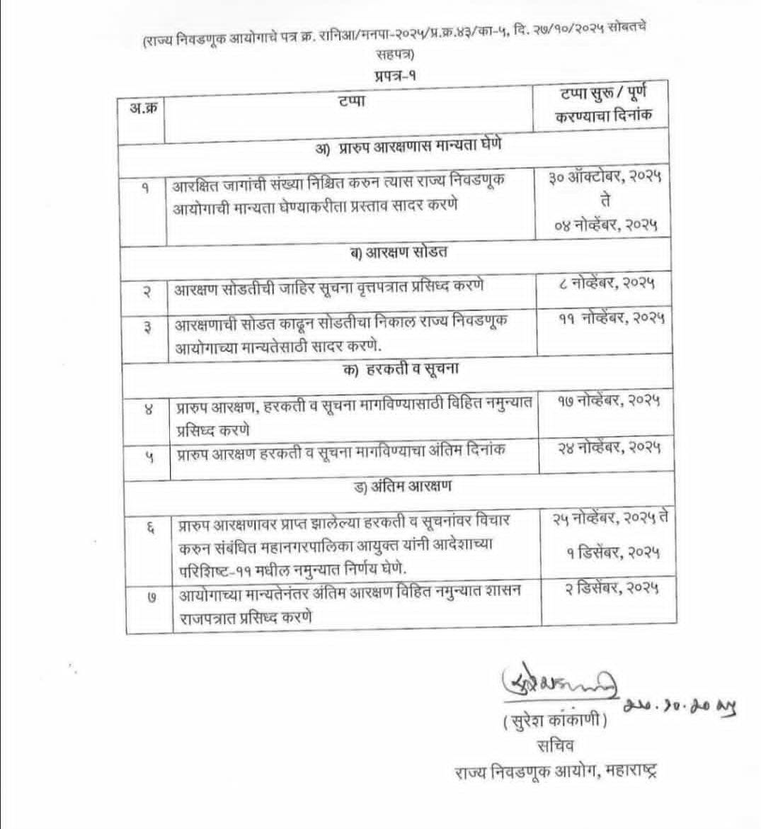 राज्य निवडणूक आयोगाचे सचिव सुरेश काकाणी यांनी मुंबई वगळून उर्वरित सर्व महापालिका आयुक्तांना आरक्षण सोडतीबाबतचे आदेश दिले आहेत. त्याबाबतचे वेळापत्रक जाहीर करण्यात आले असून त्यानुसार ही प्रक्रिया 30 ऑक्टोबरपासून सुरू होणार आहे. आरक्षित जागांची संख्या निश्चित करून त्यास राज्य निवडणूक आयोगाची मान्यता घेण्यासाठी प्रस्ताव सादर करण्याचा कालावधी 30 ऑक्टोबर ते 4 नोव्हेंबर हा असेल.
